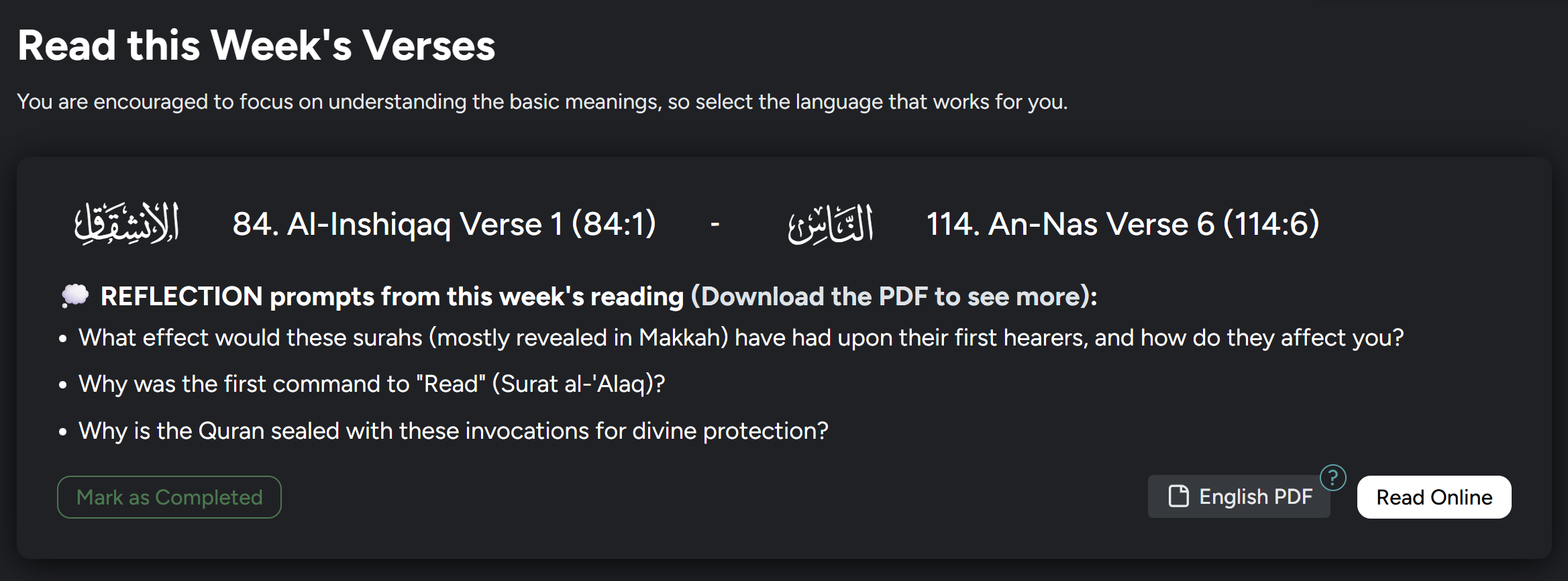 Each week now includes the ability to submit questions related to the assigned readings; helping you seek clarity and deepen understanding as you move through the Quran.